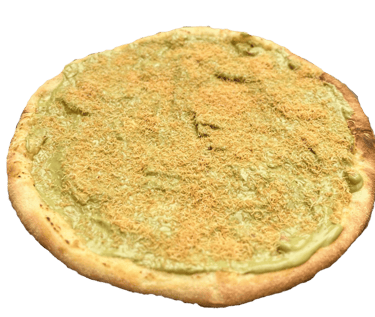 Cette pizza est unique, avec sa crème de pistache et ses vermicelles dorés spéciaux.