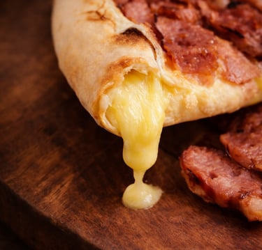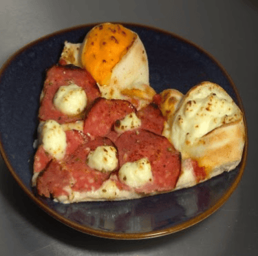 Sauce tomate, tranches de pepperoni, mozzarellafondante, petit boulles de fromage crémeux,et huile d'olive.